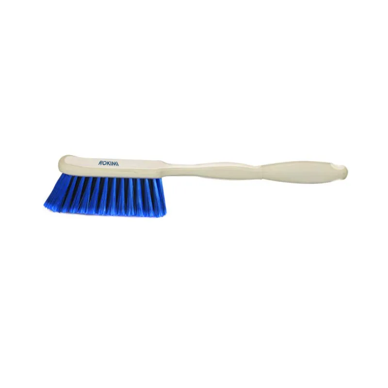 De lange ergonomische borstel van ROKIMI kunt u op twee manieren vasthouden: kort voor extra druk en stevig schrobben, lang voor de moeilijk bereikbare plaatsen. Borstel vervolgens van boven naar beneden en van links naar rechts zodat de vezels diep worden doordrongen. Bij diepe vervuiling kan stevig worden geborsteld. Door de gepluimde haren is de kans op beschadiging van uw doek erg klein. Twijfelt u over de sterkte van uw doek, voer de druk dan geleidelijk op. Let er daarnaast ook op dat u nooit de aanbevolen inwerktijd van de ROKIMI-producten overschrijdt. Na gebruik kunt u de borstel grondig afspoelen met water. Als de borstel erg vuil is mag men de borstel ook in de vaatwasser worden gereinigd